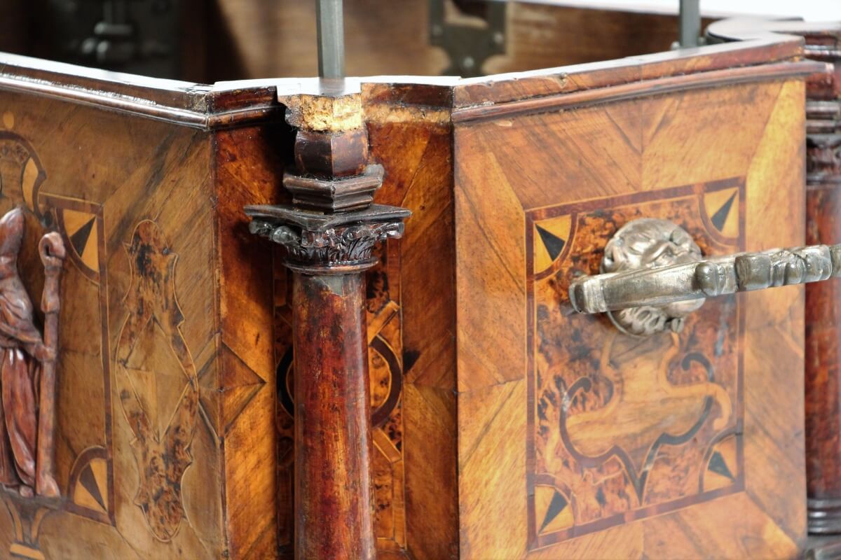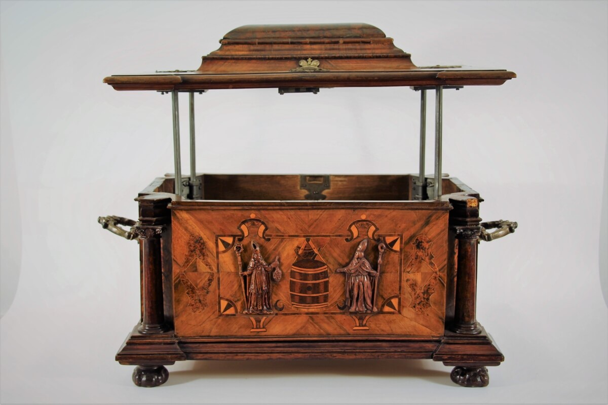 - Tölgyfából készült láda, diófa furnír borítással, tetején és oldalain berakott díszítéssel. Felépítése architektonikus jellegű, 3 részre tagolható. Négy sarkán 1–1 apró korinthoszi oszlop, elülső oldalán a kádár mesterség jelvényeit (hordó, körző) ábrázoló berakott kép, intarzia látható, melynek két oldalán a céh két védőszentje: Szent Orbán és Szent Medárd püspökök teljes alakban és püspöki ornátusban. Mindkét szent alakja buxusfából faragott. A céhláda kontyos tetejét nem fölnyitni lehet, hanem vízszintesen felemelni, ugyanis a korinthoszi oszlopokban rejtőző acélrudacskákon elmozdítható. Így a céhláda körbeülhető volt. Belül két kis fiók, alul kettős fenék található. A kontyos tetőn félrehúzható kis rejtett üregben a céhpecsétet őrizték. A ládát csak úgy lehetett kinyitni, ha a 4 kulcsot egyszerre nyitották. A ládát 1703-ban az egri asztalos és lakatos céh közös remekbe készítette, s a ládát 1872-ig használták az egri kádárok céhében.