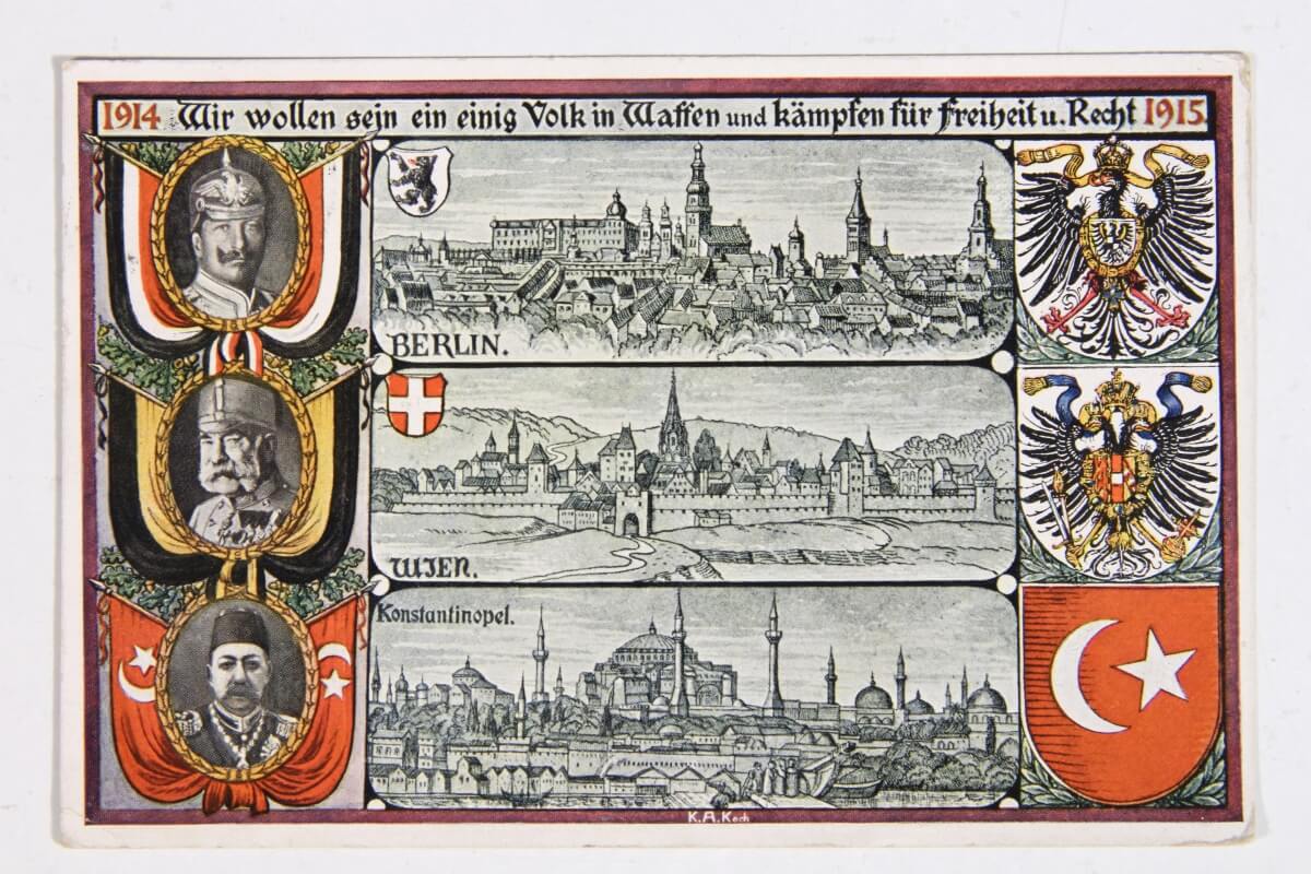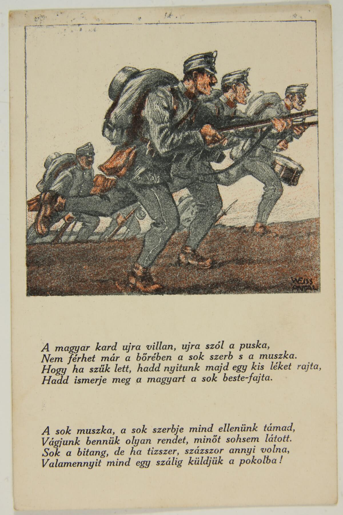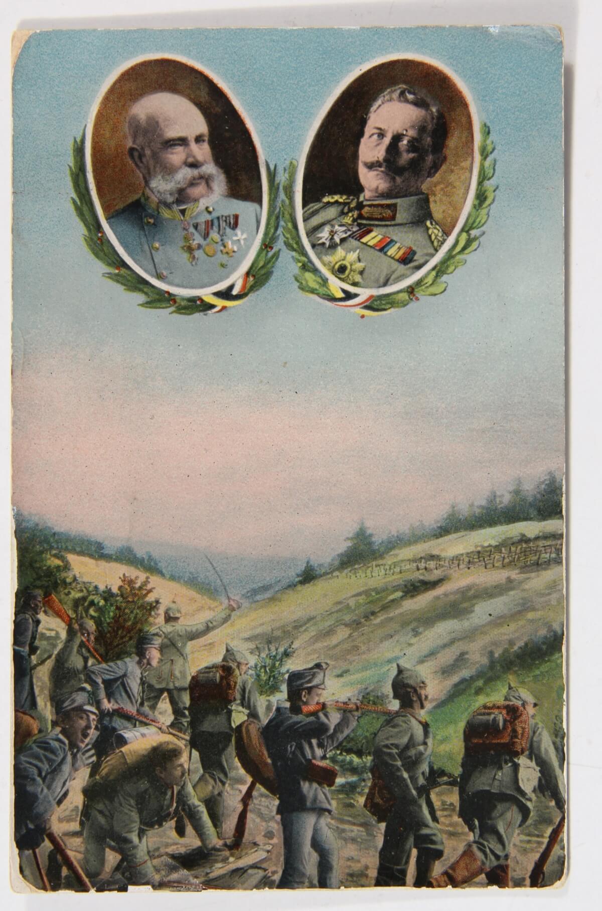Az első világháború idején a képeslapok képes oldala is nagy jelentőségre tett szert, a tömegtájékoztatás és a propaganda egyik hatásos eszközeként használták. A nagyobb, főként a Bécsben működő kiadóvállalatok több lapból álló színes sorozatokat adtak ki, amelyek a háború egyes eseményeit, elsősorban a győzelmes harcokat mutatták be. A karikaturisztikus jellegű grafikákon az ellenséges katonákat mindig negatív színben tüntették fel, míg a magyar, osztrák, német katonák ábrázolásakor azok bátorságát, hősiességét hangsúlyozták. Rengeteg képeslap készült Ferenc József császárról és az 1916 decemberében trónra lépett IV. Károly királyról, valamint – a háborús propaganda részeként, a központi hatalmak egységét szimbolizálva – a szövetséges államok uralkodóiról is. Háborús hadszínterek jelennek meg az Érdekes Újság által kiírt hadifotó pályázatra beérkezett fekete-fehér fényképek alapján készült képeslapsorozatokon, ez utóbbiakból származó bevételeket karitatív célokra, a hadi özvegyek és árvák támogatására fordították.
